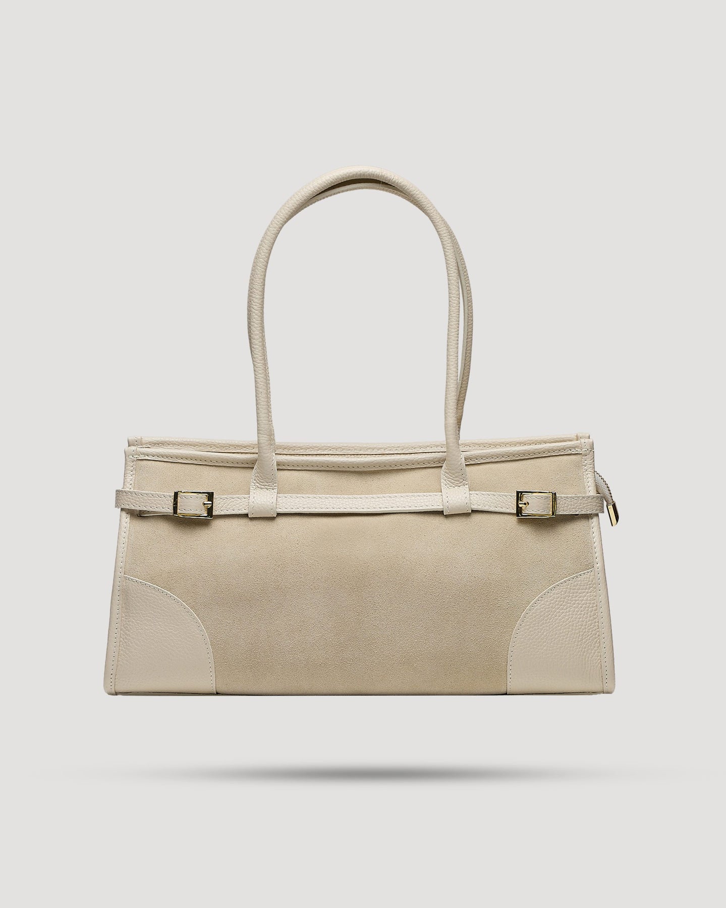 Borsa a spalla in suede e pelle liscia con zip e tasca interna.