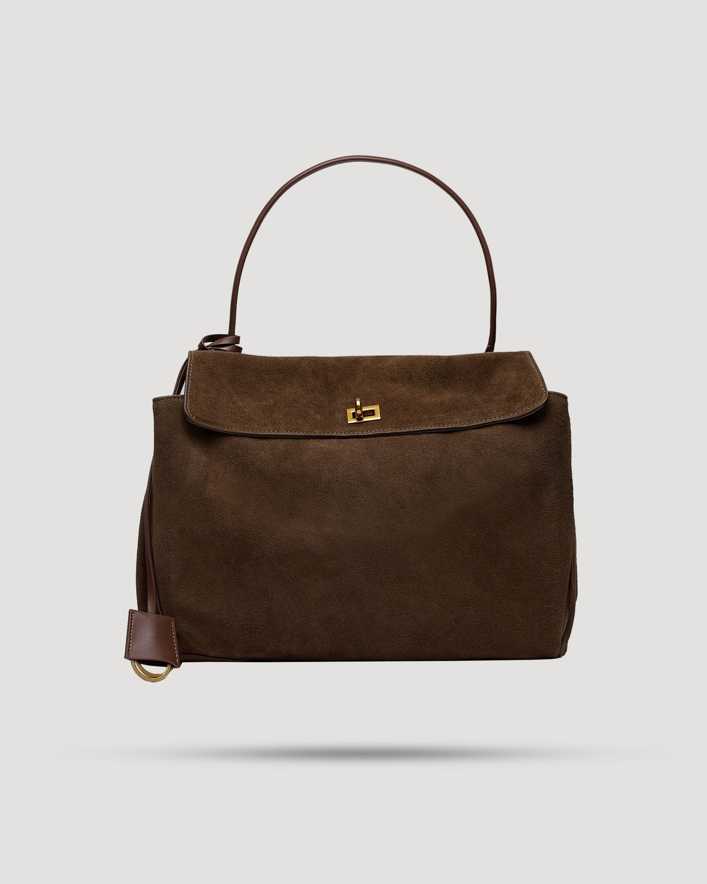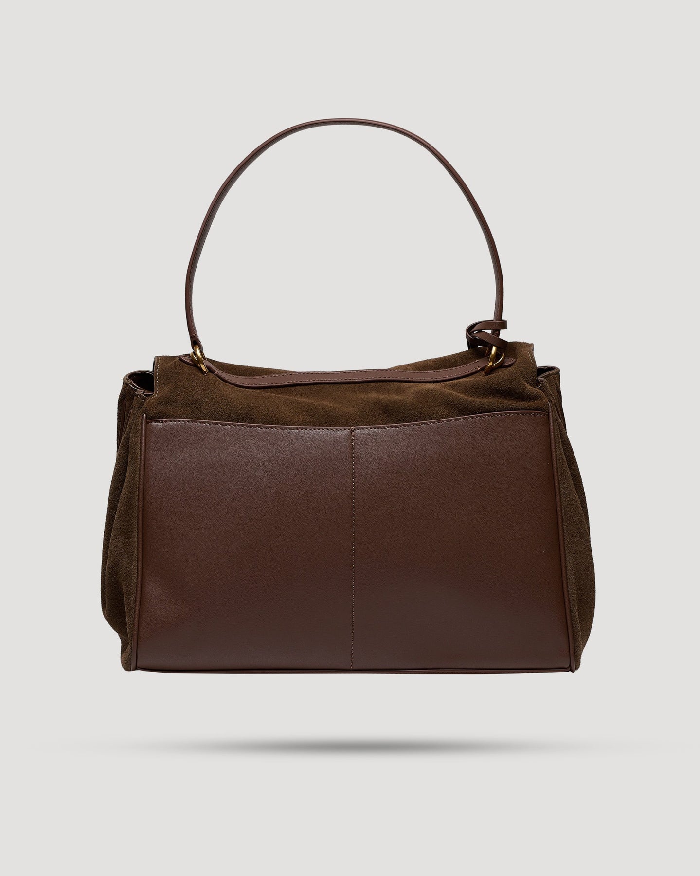 Maxi borsa cartella in suede con doppio scompartimento e chiusura in metallo dorato.