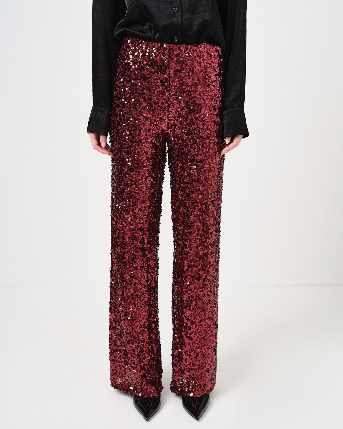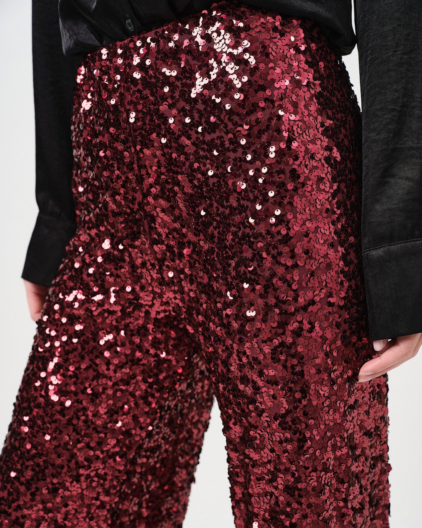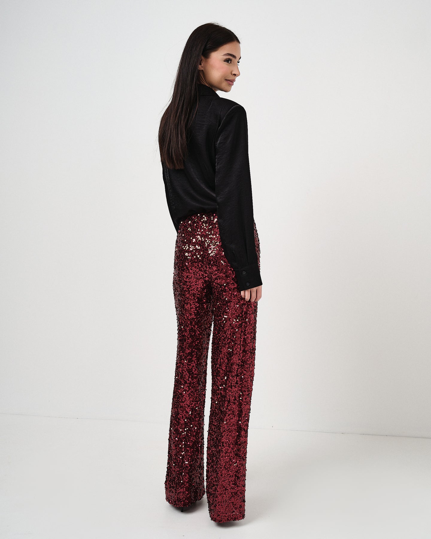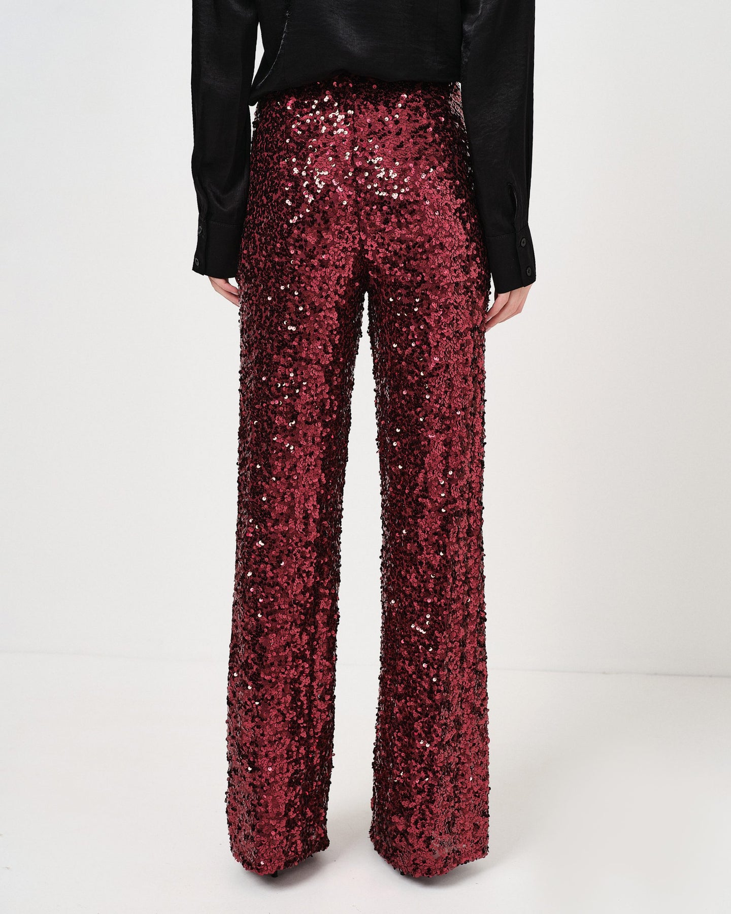 Pantalone a palazzo con paillettes ricamate ed elastico in vita.