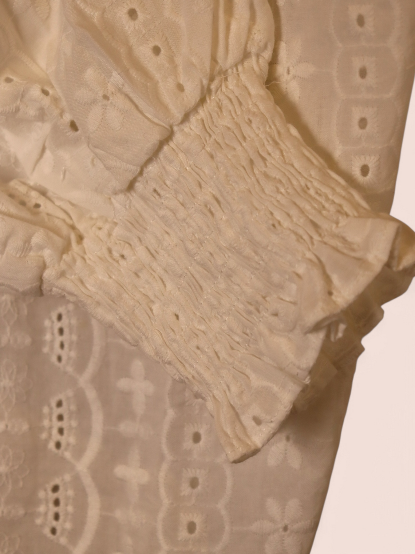 Aggiungi un tocco di eleganza romantica al tuo guardaroba con questa splendida camicia in sangallo. Il tessuto traforato con delicati ricami floreali dona leggerezza e raffinatezza, mentre il collo arricciato e i polsini elasticizzati completano il design con dettagli curati.