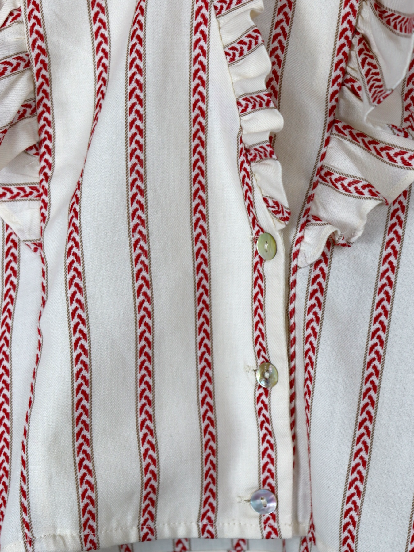 Dona un tocco di stile romantico e vivace al tuo guardaroba con questa blusa a righe bianche e rosse. Il design incrociato, arricchito da volant lungo lo scollo e le spalle, esalta la silhouette con un'eleganza fresca e femminile.