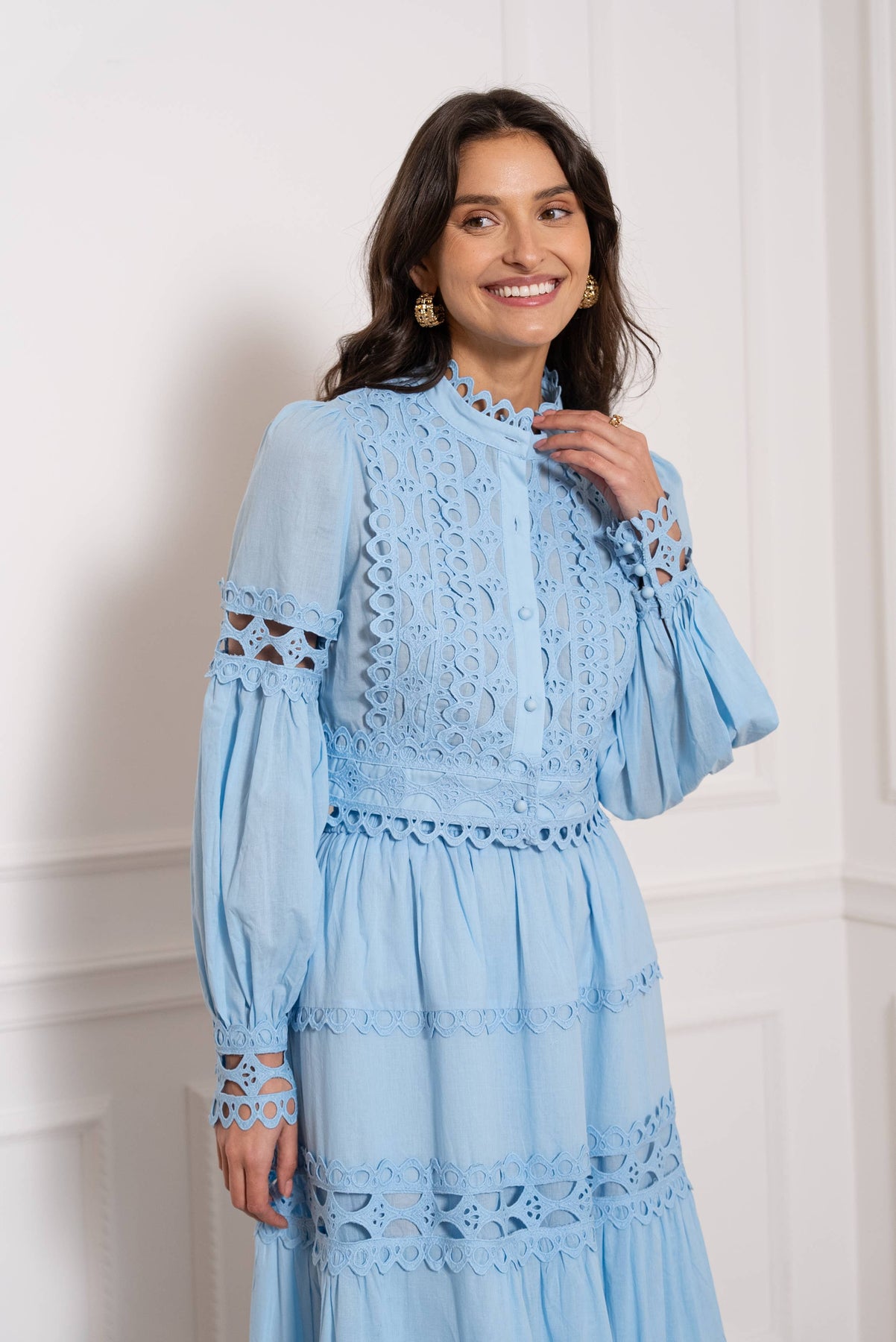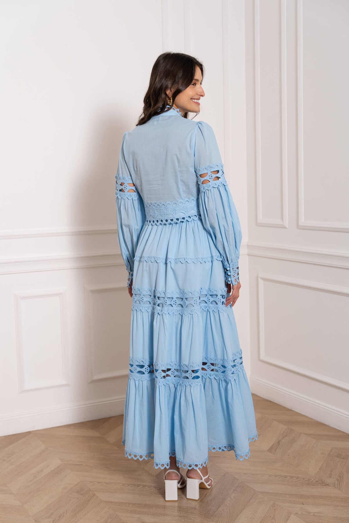 👜 Dettagli: Ricami sangallo, colletto alla coreana, maniche lunghe con polsini ricamati, bottoncini rivestiti