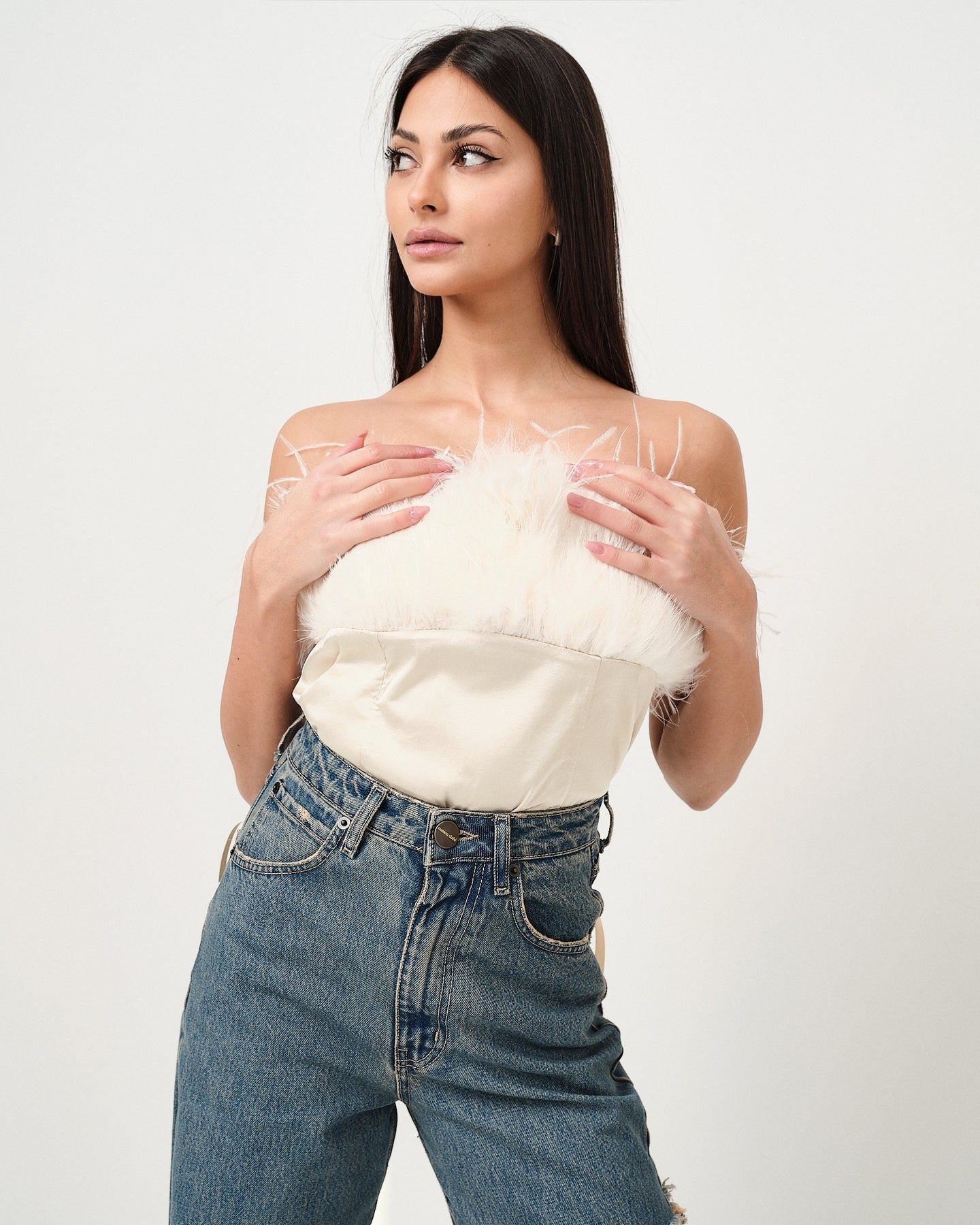 Cropped top con scollo a barchetta e dettaglio dell’inserto in piume.