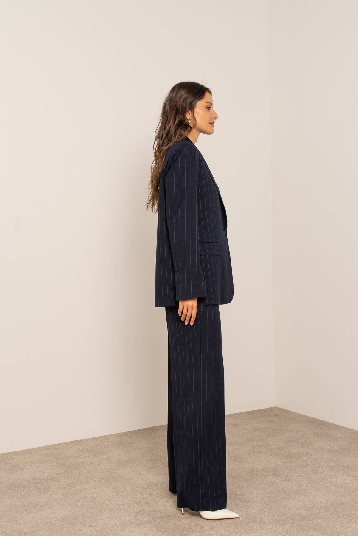 Il fascino senza tempo del blu notte si unisce alla precisione sartoriale delle righe gessate. Questo blazer è la quintessenza dell’eleganza urbana: linee nette, spalle strutturate e un’unica chiusura che esalta la verticalità del design.