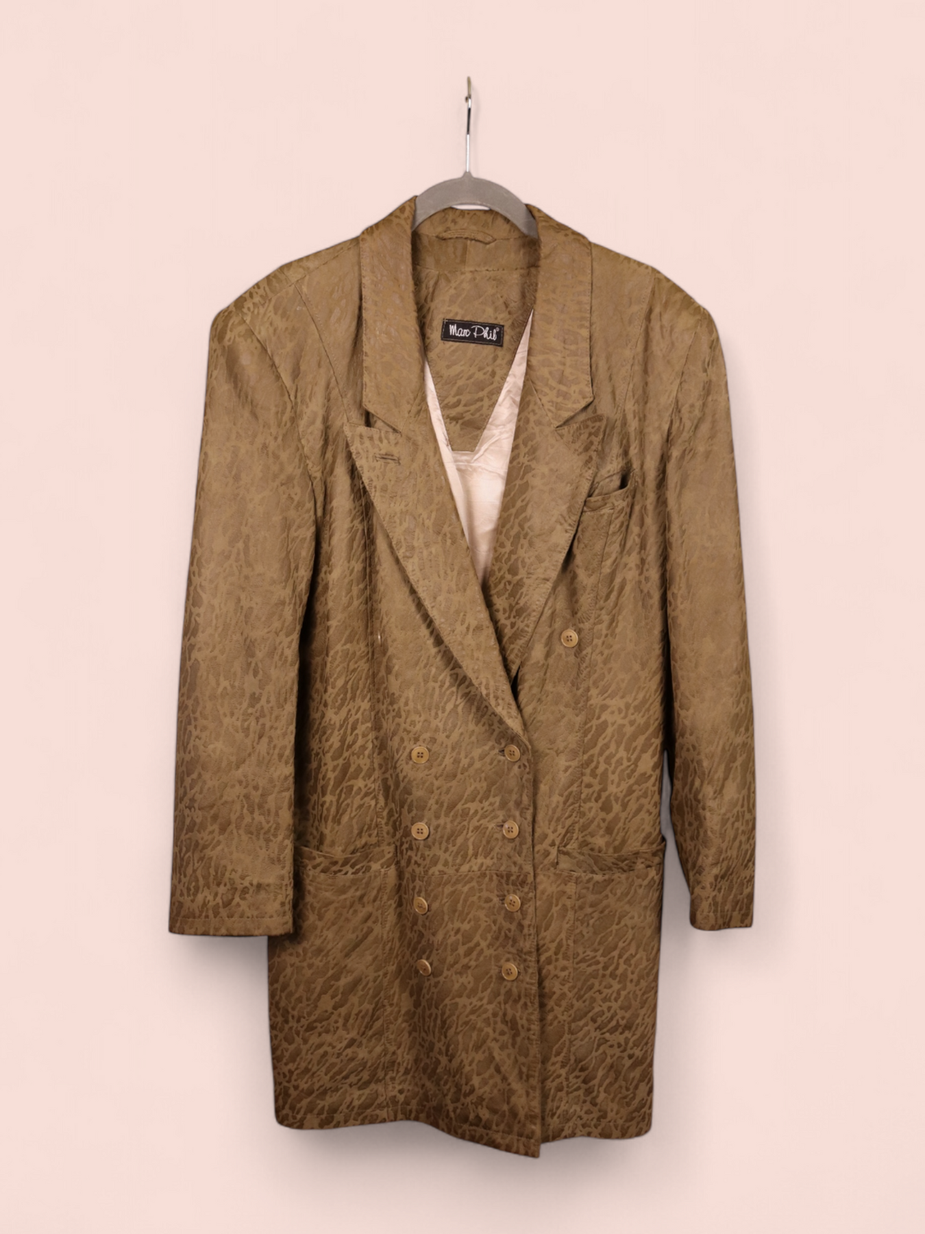 Porta un tocco audace e raffinato ai tuoi outfit con questo blazer vintage. Il taglio doppiopetto si unisce a un tessuto effetto lucido con stampa animalier tono su tono, creando un look deciso ma elegante, perfetto per chi ama distinguersi con stile.
